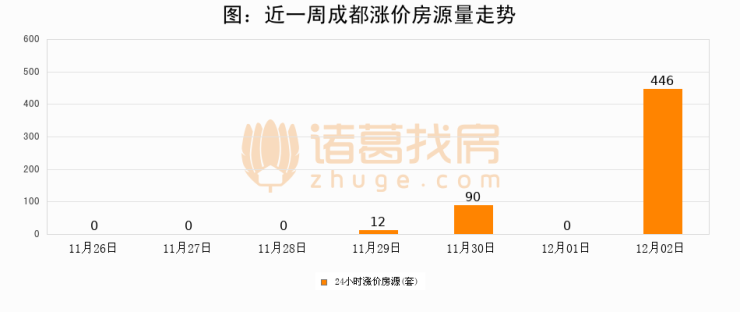 根据诸葛找房数据显示,成都24小时涨价房源量为446套,较12月01日增加446套,环比上涨0%。与此同时,涨价房源占比小幅扩大,业主信心有所提升。