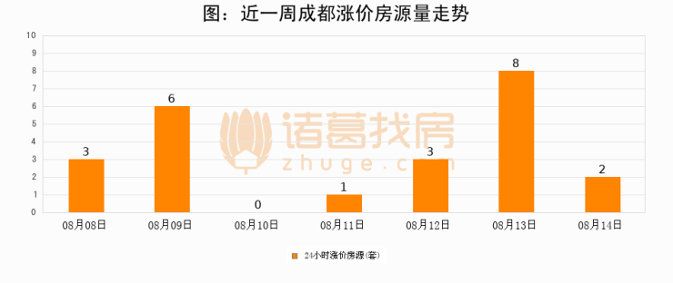 根据诸葛找房数据显示,成都24小时涨价房源量为2套,较08月13日减少6套,环比下降75%。与此同时,涨价房源占比小幅回落,对于购房者来说是一个入市窗口期,购房者可抓住时机入市。