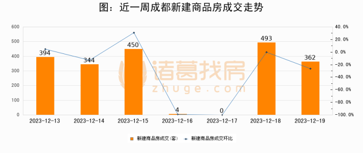 根据成都市住房和城乡建设局数据显示,2023年12月19日成都新建商品房成交362套,较昨日减少131套,环比下降26.6%