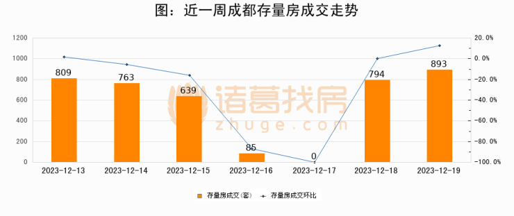 从存量房来看,2023年12月19日成都存量房单日成交893套,比昨日增加99套,环比上涨12.5%。从近一周存量房成交来看,成都存量房日均成交套数为569套,12月19日单日成交893套,高于近一周平均水平56.9%。